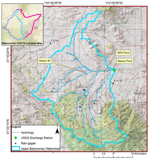 Calibration is suggested to improve model performance and increase the reliability of flow predictions, especially to analyze the effect of land-use change impacts [62,63]. We modeled the Upper Babocomari Watershed (412 km2; Figure 3) using associated precipitation and discharge gages to calibrate the model for volume estimates and using documented local parameters.
