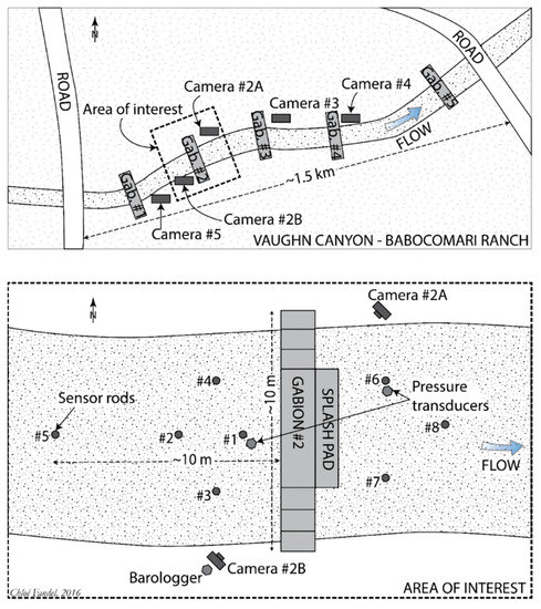 Fandel et al. [53,54,55] tested low-cost methods for quantifying the total infiltration induced by gabion construction over the course of a single flow event. Time-lapse cameras, buried temperature loggers, and pressure transducers recorded data from June 2015 to February 2016 at Gabion #2 (Figure 5 and Figure 6). All instruments were synchronized to collect a data point every five minutes for the duration of the study period. Soil properties were measured and averaged at 5 different locations in Vaughn Canyon. At the beginning of the study, a borehole permeameter was used to determine in situ saturated hydraulic conductivity (K), and soil samples were taken to quantify dry bulk density and porosity at the structure [54].