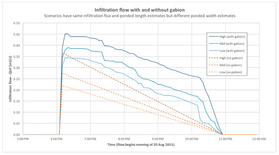 To evaluate the impact of a single gabion on infiltration volume, a total of 225 scenarios were run using Gabion #2 dimensions, a range of saturated hydraulic conductivity, and a comparison of ponding patterns pre- and post-gabion installation (Figure 8). Post-monsoon hydraulic conductivity estimated by Fandel [54], using temperature methods, was lower upstream (25–54 mm/hr) than downstream (~100–400 mm/hr), likely due to clogging caused by ponding and consequent deposition of clay. Using these ranges and a 4.5-h flow, the gabion’s impact on infiltration ranged from no influence (gabion did not change ponding patterns) to an increase of 225% (assuming minimal pre-gabion ponding), with the most likely scenarios depicting an increase of approximately 10% [53,54,55]. Figure 8 portrays 6 scenarios with the same infiltration flux and ponded length, but different ponded width (based on time-lapse photography). Because no photo data were available for pre-gabion flow events, the no-gabion estimates were based on a linear decrease in ponded width over time and starting widths derived from channel morphology. The impact of the gabion on total infiltrated volume is the area under the curve with the gabion minus the area under the curve without the gabion [53,54,55].