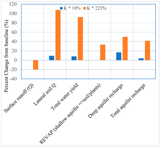 Given this scenario, the calibrated model predicts the average annual water budget basin values will be greatly altered (Figure 9). Surface runoff could potentially decrease (0–20%) and the lateral soil runoff could increase (9%–108%), pushing water underground. Groundwater (shallow aquifer) is predicted to increase (4%–42%) and groundwater (deep aquifer) could also increase (17%–50%). Total aquifer recharge could increase (4%–41%) and total water yield will increase (8%–92%). Percolation out of the soil will also increase (4%–42%; Figure 9).