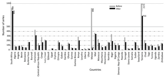 Result of the selection process between redundant time-series—in grey, the number of series at the beginning, and in black, the final number of reference series for the period 1900/1999, where each series corresponds to a unique station. Note: Due to insufficient data availability, Madagascar has not been processed in this project.