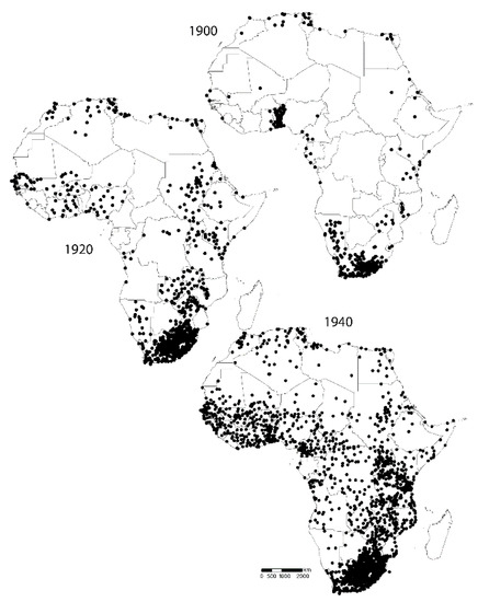 The HSM_SIEREM base was exported in the form of one file per country and per year, over the period 1900/1999. The first goal was to create monthly grids for the whole of the 20th century. However, when plotting the measurement points, the maps showed that before 1940 (Figure 3), the data were too sparse and too heterogeneously distributed to be spatialized over the whole continent. The decision was then made to limit the interpolation process to the period 1940/1999. Contrary to CRU, we decided not to create a reference period like the ones the CRU used to establish patterns to create interpolated rainfall measurement points [9]—even for the years where the distribution of data was heterogeneous or density of stations was low—enabling them to start the interpolated time-series in 1900. This limited our possibility to extend the grid to a period prior to 1940. However, this is also what makes a fundamental difference between the HSM_SIEREM and the CRU grids, i.e., in the HSM_SIEREM database, each month, the grid was calculated only from the available observed data.