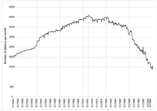 All African National Meteorological services were then contacted to update the data series at a monthly time-step, especially from the last 20 years of the 20th century, but only a few of them sent recent monthly data. The number of months (Figure 4) with available data, therefore, varies from 4061 stations in 1975 to 1464 stations in 1999. This shows a decrease of the number of observed rain gauges; this trend started as soon as the 1980s and has been observed worldwide, but it affects Africa more severely. However, the HSM_SIEREM database still has a sufficient number of points, compared to the Global Historical Climatology Network (GHCN) values—2500 gauges, worldwide, for the year 2000 [5], compared to a little less than 1,500 for Africa alone, in our database, for December 1999.