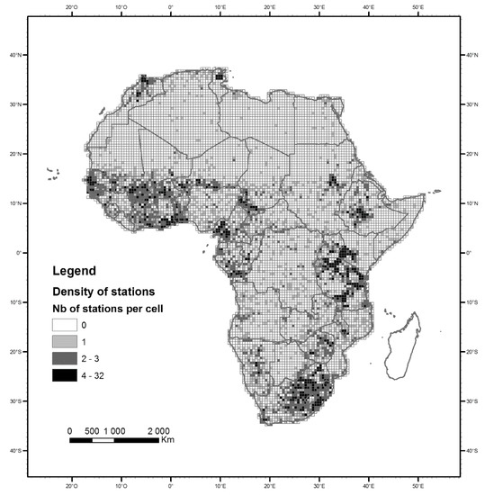 As it is very difficult to gather observed data covering the whole continent since 2000, it is improbable that an update of this study might be performed, knowing that, since then, a number of rainfall gridded product have been released on the basis of satellite-derived rainfall estimations [35], which help fill the gap between the needs of researchers for recent data and the unavailability of a free international observed rainfall database. The length of the time-series was, thus, adapted for a comparison of historical time-series and rainfall time-series from the GCM/RCM reanalysis, or for study of time-series for regions where data are difficult to obtain, even for historical periods.
