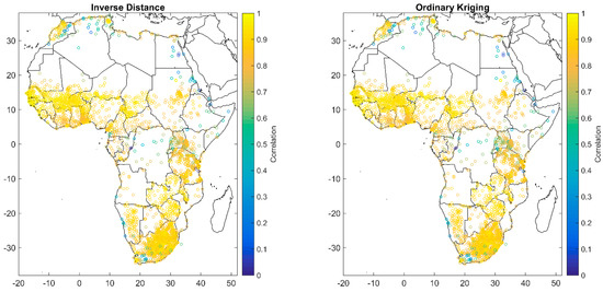 The validation results indicated very similar performances between the IDW and the OK, with an average correlation coefficient of validation of 0.86 for the IDW and 0.85 for the OK. The relative bias over all stations was equal to 7.8% with IDW and 7.1% with OK. The spatial patterns of the validation results are very similar, as shown in Figure 6, for the correlation coefficients of the validation samples being obtained with IDW or OK. The areas with the lowest density of stations, such as East Africa or south of the Maghreb countries, had the lowest performances in validation. Therefore, the interpolated precipitation in these areas must be interpreted with care.