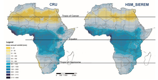 The differences between both grids could be due to the difference in the statistical approach of data processing and due to the density of observed stations. According to the figures given in Eklund et al. [26], the number of stations in Africa in the CRU data set was twice lower than that in the HSM_SIEREM data set, between 1940 and 1985, and three times lower after 1985. The maximum number of stations was over 4,000 for the HSM_SIEREM and less than 2000 for the CRU in the mid-seventies. It is quite likely that a greater number of stations will undergo a better precision in rainfall interpolation, at a grid scale.