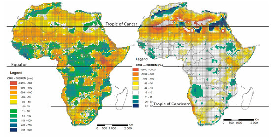 - A total of 4402 cells (in brown and yellow), i.e., 43%, had values ranging from −10% to −15,640%, compared to the HSM_SIEREM grid. They were mostly located in the Sahara and overlapped with the Sahel. In this area, the CRU grid had wide areas with values of mean annual rainfall between 0 and 20 mm, while the HSM_SIEREM ranged from 10 to 50 mm.