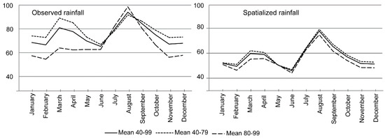 For observed data (in the left, in Figure 10), the graph showed two rainy seasons, February/ay and June–October. The first rainy season occurred in the austral hemisphere and the second occurred in the boreal hemisphere. The second rainy season remained the rainiest and the differences between the three periods were limited. Concerning the first rainy season during the month of March, the monthly values reached during the years 1940/1979 were clearly much higher than those during the years 1980/1999—the mean monthly rainfall value decreased from 90 mm to 64 mm, by almost 30% for the observed values. For the gridded data set (in the right, in Figure 10), values showed the same interdecadal variability, but with lower monthly values and a lower difference between the periods. The difference for March was still significant, with a reduction of 12% after 1980, from 62 mm to 55 mm.