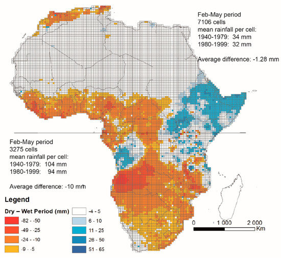 The results confirmed that the African continent was seriously affected by a rainfall deficit and a change in the rainfall regime at the end of the 20th century. The first assessment showed that the two main periods of rupture in the time-series was between 1969/1970 and 1979/1980, which are depicted in the global African rainfall times-series issued from the whole data set, in both, the gridded and observed time-series. It seems that it was the first part of the year, from February to May, which registered the highest rainfall reduction, especially in the austral part of Africa (Figure 11). This reduction was several times higher than the rainfall reduction in the boreal part of Africa, at the same period. Even if part of these figures might be linked to the interpolation of unevenly distributed observed rainfall stations, this could have had strong incidences on the global climate of the area and requires further studies to analyze the regional variability of rainfall over the continent, between different databases.