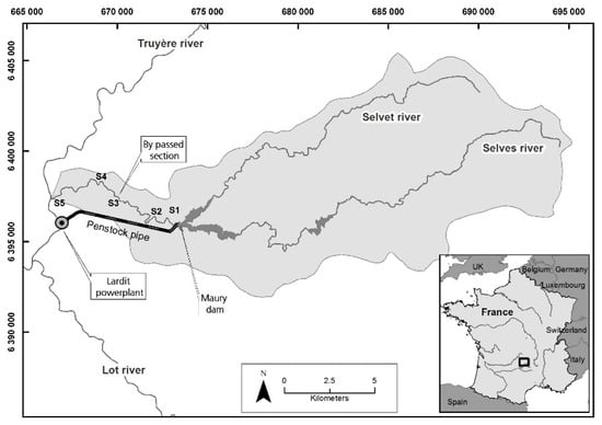 Location of the Selves River, its catchment area and the bypassed reach downstream of the Maury dam.