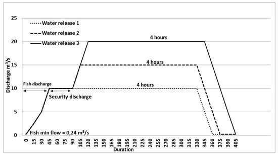 The releases were carried out on 6, 13, and 20 September 2016, to avoid conflicting with other uses or temporal constraints: (i) In the summer, the reservoir needs to be kept at a high level to satisfy tourism requirements, and safety risks are at their highest because of extensive fishing in the bypass reach; (ii) heavy rain is likely in autumn and could disrupt the experiment; (iii) salmonid spawning, incubation and growth phases take place from November to June. Various authors [22,40,52,53] have outlined the biological risks of this kind of operation on spawning, incubation or survival rate of juveniles.