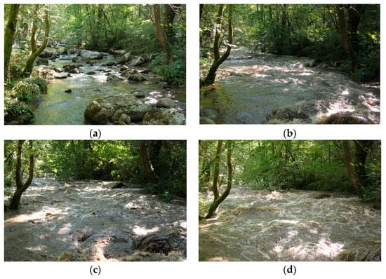 View from downstream of Station 4 (see Figure 1 for location) at (a) Minimum flow (b) 10 m3/s, (c) 15 m3/s, (d) 20 m3/s.