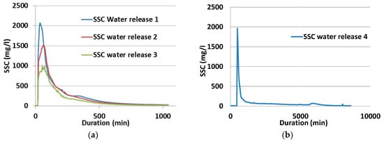 SSC was closely monitored to meet regulatory requirements and to evaluate the success of the releases with respect to the export of fine sediments. The SSC peaks coincided with the flood waves and their peak values decreased for each successive release, despite their increasing intensity. Similar decreases in SSC have already been observed in other rivers following successive releases which have the same peak discharge value [36,62,63].