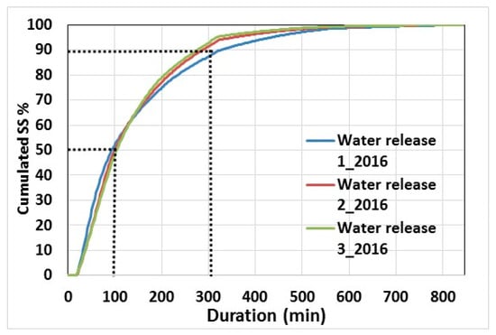 For the three water releases in 2016 with a 4-h peak discharge, the SSC levels were substantially reduced just 2.5 h after flooding, by a factor of 4, 3, and 2 after the three water releases, respectively. The cumulative SSL curves (Figure 7) also demonstrate that 50% of the sediment was transported in less than 2 h and around 90% in 5 h. The duration of the 2016 releases was, therefore, sufficient to export most of the fine sediment that could be transported in suspension.