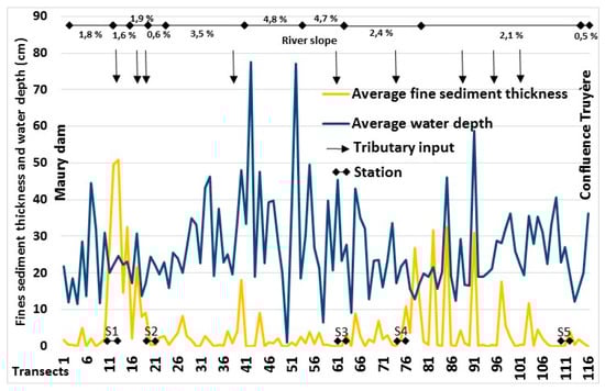 The average thickness of silt and sand was reduced by a factor of 1.8 in the bypassed reach channel after the four releases, which is largely due to the export of silt. The reduction in fine sediments below the dam had positive effects on substrates, and more generally on physical habitats, by increasing the water depth at low flow. This last effect, which is not obvious at the bypassed reach scale, is clearly positive for the monitoring stations most sensitive to fine sediment deposits. Other authors have previously reported an increase in water depth following water releases [12], creating new habitats for fish, however, for the Selves River, this is a localized effect (only very clogged stations were affected) and does not apply to the whole reach.