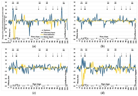 Change in average water depth and fine sediment thickness on each of the cross-sections in the bypassed reach. (a) T0_16–T3_16, (b) T3_16–T0_17, (c) T0_17–T1_17 and (d) T0_16–T1_17.