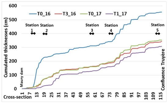 The change in cumulated fine sediment thickness between successive releases clearly showed a drop in the sedimentary stock of fine materials in the river (Figure 10). The first 3 releases performed between T0_16 and T3_16 had a significant effect. The cumulated average fine sediment thickness reduced by a little more than 29% following the three releases. However, only a small difference is observed between T3_16 and T0_17. A slight trend for sand to aggrade is again observed at the first tributary confluence for Station 1 and after the river gorges. The final release also contributed to a drop in sedimentary stock, but to a lesser extent. Downstream of Station 1, progressive erosion is clearly evident between T0_16 and T3_16 and between T3_16 and T1_17. It is the clearest erosion effect observed on the reach. The downstream V-shape narrow valley reach (between Station 2 and Station 3 or even 4) generally seems to be in sediment balance, since sediment inflows and outflows do not seem to have any repercussions on the changes to fine sediment thicknesses between releases. This is, therefore, a sediment transfer reach. Erosion processes then pick up again downstream of the narrow valley, and the balance stabilizes after the valley widened (downstream from Station 4).