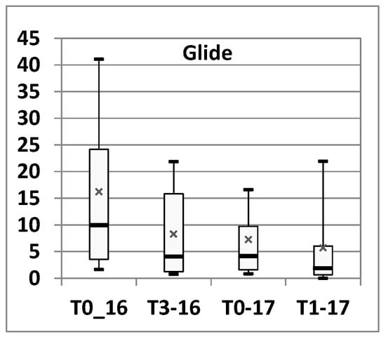 Changes in fine sediment thickness are significantly tied to the various mesohabitats units [61]. In particular, changes were particularly clear for glides (Figure 11), where median sediment thickness dropped considerably after each flow release (reduction by a factor of 2 or more). Faster flowing mesohabitats units (riffles, cascades, and rapids) showed no change.