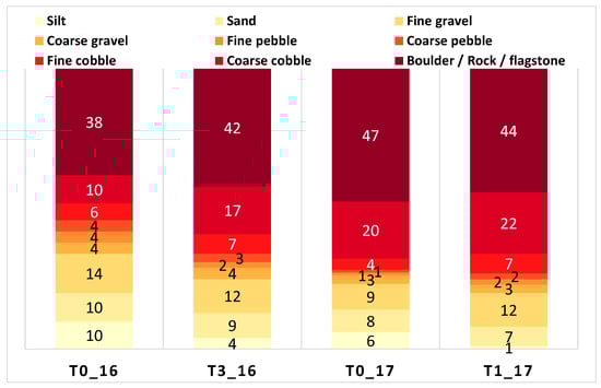 Bed-sediment composition became progressively coarser during the experiments, as determined by measured grain-size distributions (Figure 12). The proportion of silt was reduced by a factor of 2.5 after the three short releases of 2016 (from 10% to 4% between T0_16 to T3_16) and became null (1%) after the long release of 2017 (T0_17 to T1_17). The intermediate period between the third and fourth releases led to slight silt deposits (+2%, T3_16 to T0_17). The proportion of sand in the sediment distribution decreased very slightly after each release, although a portion of the sand was exported to the edges (observed but not calculated). As a result of the overall decrease of fine sediments, coarse particles, such as boulders, rocks, and flagstones, and primarily coarse cobbles were more common after the releases.