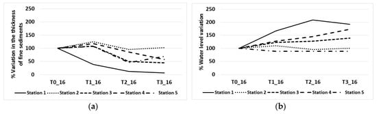 (a) Evolution of average fine sediment thickness and (b) average water level before and after each 2016 release at the 5 stations (100 base level at T0_16).