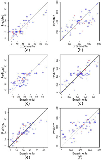 After determining the errors in the prediction from the regression models of the training and test data, a scatter diagram of the variables was created. Figure 1 shows the scatter diagrams or relationships between the actual values that were obtained experimentally and the values of finTurb that were predicted by the quadratic models of (Figure 1a,c and e) and TSS (Figure 1b,d and f) for each of the tested coagulants—ECOTAN BIO 90D, ECOTAN BIO 100 and ECOTAN BIO G150. The blue points relate to the 54 data points that appear in Table 2. The red points relate to the 11 additional experiments that the regression models used. They appear in Table 11. If the variables in this case are correlated, the points will follow the diagonal line or curve. The better the correlation, the closer the points will be to the line. Because all of the red dots (test data) are closer to the diagonal line than are most blue dots (training data), their correlation is greater. Because there are fewer test data points than training data points, the MAE and RMSE errors in the testing analysis and training analysis are similar (see Table 11 and Table 12).