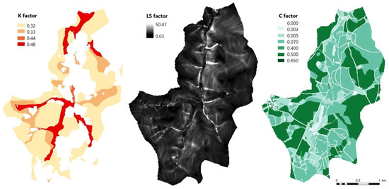 These parameters are given in the form of raster files and in some cases as constant values for the entire area of interest. All models used in the study work on the basis of the RUSLE equation, but some parameters are not applicable for the conditions of the Czech Republic according to the RUSLE methodology because of a lack of data. The equations used are therefore a combination of RUSLE and USLE approaches. The specific values used for the individual equation factors and their sources are presented in Table 2. The spatial distribution of some factors (i.e., K, LS and C factor) within the basin is shown in the maps in Figure 3.