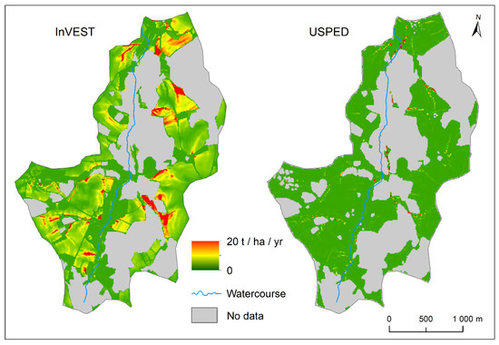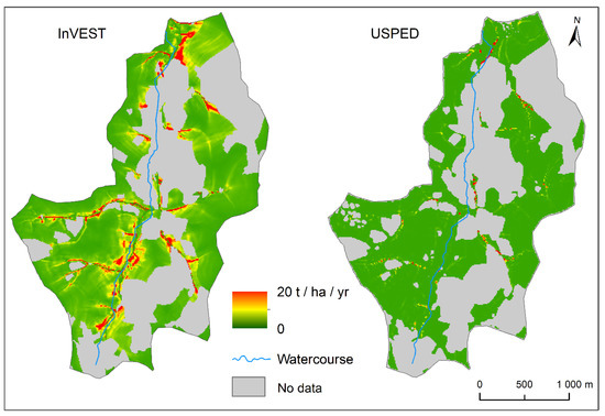 Sediment accumulation as a result of soil loss caused by water erosion in the study area—comparison of InVEST and USPED outputs.
