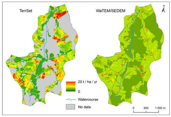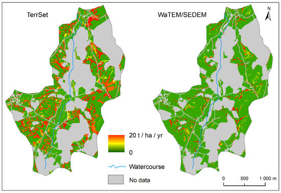 Soil loss in the study area based on the results of the TerrSet and WaTEM/SEDEM models.