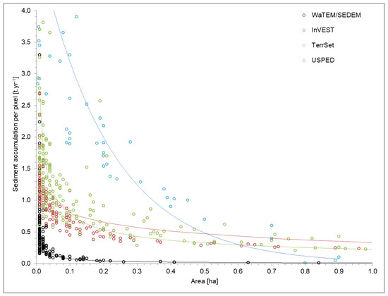 For the efficient interpretation of differences in the results of the analyzed models, graph (Figure 10) was created. The graph show the course of the dependencies between the amount of sediment accumulation (i.e., soil accumulation per an area of one hectare) and an area that is characterized by given specific soil accumulation capabilities. Based on Figure 10 it is obvious that the analyzed models have different results in terms of their quality. From the distribution of values within the correlation plot, it can be stated that the greatest differences is observed between the W/S and the USPED model, where W/S assigns a large number of pixels with very low soil accumulation values, the USPED assumes the occurrence of pixels with significantly higher values. The TerrSet and InVEST models have a very similar distribution of values within the correlation plot.