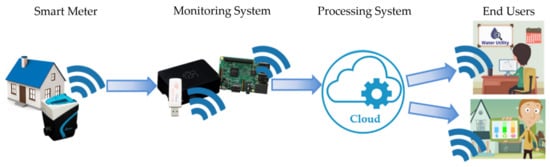 In particular, a real-time water consumption monitoring and processing system was developed, aimed at recording consumption data at the user’s connection to the water distribution network. It transfers the data collected to a cloud platform, where consumption data are processed in order to produce valuable information for the end users, both Water Utility (WU) and its customers [7]. In fact, the entire system allows consumers to know their consumption in near real time and to receive an alarm message in the event of water leaks downstream of their own water meters. As a result, users can become more aware of their water consumption and avoid waste of water. At the same time, the entire infrastructure enables the WU to maintain real time monitoring of the water consumption of all users. As a result, the WU achieves an improved and more sustainable management of the water distribution network.
