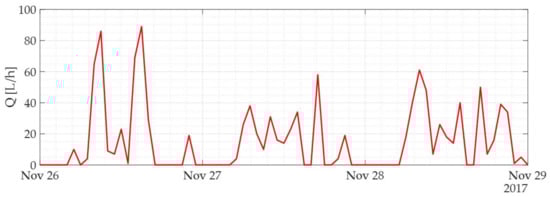 Specifically, for this user, characterized by a lower water consumption than the previous one, an FN of 72 was obtained when A2-5 was compared with the benchmark, while an FN of 203 was obtained when A0-24 was compared with the benchmark. Figure 7 shows the time series of the hourly flow rates for this user recorded from 25 January to 1 February 2017.