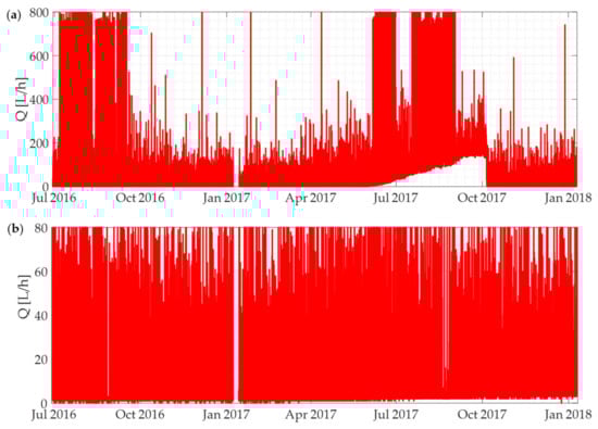 A field laboratory was created at Gorino Ferrarese (FE) with the goal of testing the water consumption monitoring and processing system developed. This small village, located in northern Italy, has an area of about 3 km2 and corresponds to a natural DMA where the entire distribution network is fed at a single point and supplies about 650 residents. These inhabitants correspond to a total of 293 users, of which 276 are residential and 17 represent public-, commercial-, and tourism-related activities. In this DMA, in the spring of 2016, CADF S.p.A., the water utility managing the network, and a project partner replaced the traditional meter devices with electromagnetic smart meters. These meter devices, entitled Sensus iPerl, provide a metrology R800 that assures accurate measurements starting with flow rates as low as 1 L/h. However, operatively, these smart meters can record variations, in terms of cumulative consumed water volume, no less than 1 L in the set time interval, where the set time interval is at least 1 min with remote meter reading (RMR) monitoring and at least 15 min with AMR monitoring. The installation of these smart meters made it possible to undertake a data collection campaign, which involved making preliminary use of an RMR system in a walk-by mode and evaluating the ability of the smart meters to record consumption data. Therefore, from June 2016 to March 2018, the time series of the cumulative volume of water demanded by each user were acquired. All collected data were stored in a one-hour time step time series database, for a total of around 4,500,000 records. Hourly data acquisition of water consumption allows users to be updated almost in real time on their water consumption and on the possible presence of water leakages in their homes. In particular, the collected data were subjected to a preliminary cleaning and pre-processing step. Specifically, the whole dataset was cleaned of the consumption information on commercial users and only residential users were taken into consideration since, as previously observed, the proposed method was based on considerations that typically applied to residential users. On the other hand, the consumption information relating to some residential users was rejected, as their smart meters were faulty and, for this reason, they recorded a decreasing cumulative volume. This problem was due to a particular set of meters provided by the producer. This set of faulty meters represents a high percentage, about 28% of the 293 smart meters belonging to the DMA, which in turn does not represent a large set compared to other field experiences, such as the one described by Britton et al. (2008) [13], where 22,000 m were installed. As a result, the final dataset used included the hourly cumulative volume time series of 193 residential users for the period from 29 June 2016 to 9 January 2018. These time series were pre-processed to obtain hourly time series of flow rates for each user and they were examined by an expert analyst, who performed a visual and manual analysis in order to characterize the water consumption pattern. The analysis was carried out by combining, for each user, the observations obtained from the analysis of the trend in the cumulative volume with those deriving from the pattern in flow rates. The majority of residential users showed a consumption pattern typical of domestic users, in which the periods of high consumption, occurring mainly during daylight hours, alternated with periods in which consumption decreased, even reaching zero values (typically during night-time hours). However, some residential users showed an unusual consumption pattern, due to the presence of leakages inside their homes. While large leakages were identified by analysing the time series of the cumulative volume, since they involved a clear increase in the slope of the consumption trend, identification of the small leakages required the analysis of the hourly flow rate time series. In fact, different types of leakages were identified, differing in size and behaviour: From large leakages due to broken pipes (Figure 4a), to small leakages due to the faulty operation of plumbing systems and sanitary appliances (Figure 4b). Overall, 192 leakages were identified during the monitoring period, with 54 corresponding to water losses of more than 10 L/h and 138 corresponding to water losses in the range from 1 to 10 L/h. The identified leakages were promptly reported to the WU, which in turn, alerted users. Subsequently, the water leakages reduction was verified through field inspections.