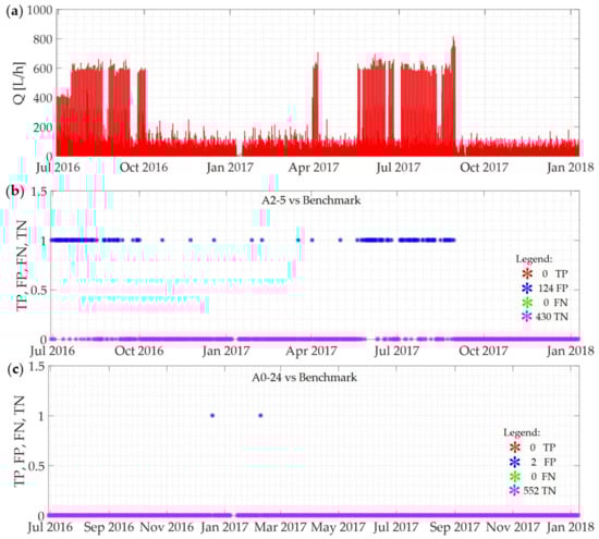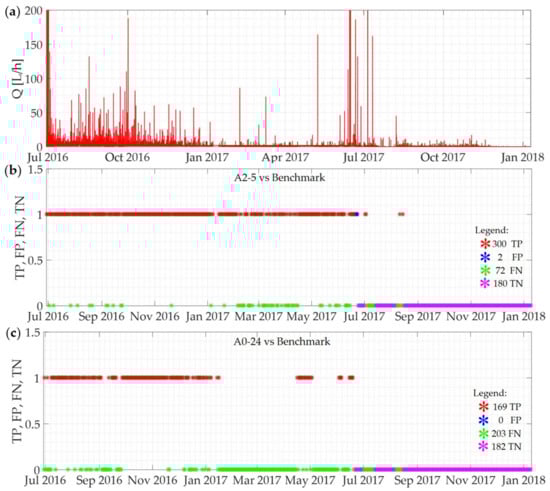 (a) Hourly flow rate time series of a user characterized by a strong seasonal variability in water demand; (b) results in terms of true positive (TP), false positive (FP), false negative (FN), and true negative (TN) obtained by comparing A2-5 against the benchmark and (c) results in terms of TP, FP, FN, and TN obtained by comparing A0-24 against the benchmark.
