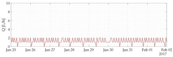 Hourly flow rate time series of a user characterized by a water loss of less than 1 L/h, recorded from 25 January to 1 February 2017.