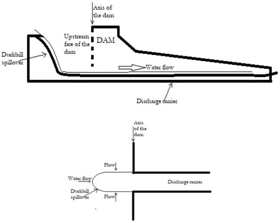 Cross section (above) and upper view (below) of the duckbill spillover. Elaboration: Juan Pablo Hidalgo-Bastidas.