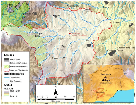 Río Grande basin and Dam location. Source: Andalucía cartographical base, 2015. Prepared by: Pacheco, 2017 [45].