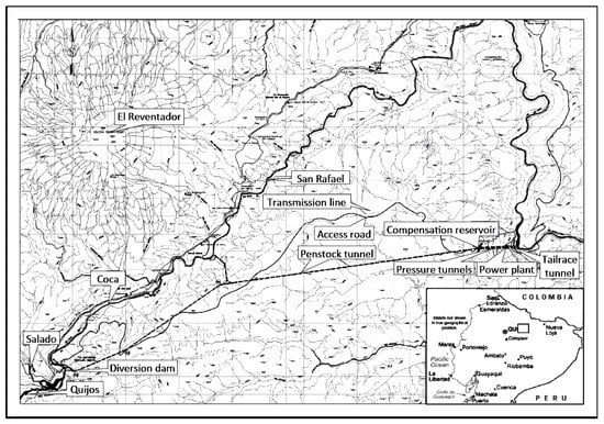 The CCS is located in the Napo and Sucumbios provinces, approximately 100 km east of Ecuador’s capital Quito, in an area where the River Coca is formed by the waters of the Quijos and Salado Rivers (Figure 1). The CCS diverts water just below the confluence, piping flows to a power plant about 25 km downstream of the diversion dam. The total drop at the powerhouse is 620 m [].