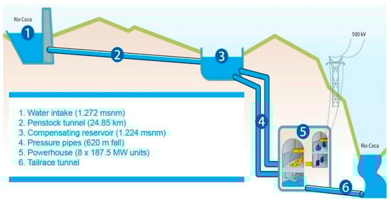 The water intake consists of a concrete-face rockfill dam, a concrete spillway and an intake between them (Figure 2). The water diverted from the intake runs via the sedimentation basin through the 24.85 km tunnel into the compensating reservoir (with 800,000 m3 usable volume), and via the almost 2 km-long penstocks to the eight Pelton-type turbines, each with a capacity of 187.5 MW. The CCS’s run-of-river intake has a maximum capacity of 7500 m3/s. The project has been in operation since 2016; the first commercial phase entailed taking four units to operation in August 2016, and the second included the remaining units in December 2016. According to the MEER [], the project contributed to the National Interconnected System (NIS) by 11,603.76 GWh by May 2018. Nevertheless, the project has also suffered from technical difficulties. In 2012, a tunnel collapse during the construction caused the deaths of 13 people. In October 2018, CELEC EP announced that three out of eight generation units were not operating because of major disconnections in the system. The power cuts in the transmission lines affected many Ecuadorian cities, and two newly launched hydroelectric projects (Minas San Francisco and Delsitanisagua) were used to replace the energy shortage [].