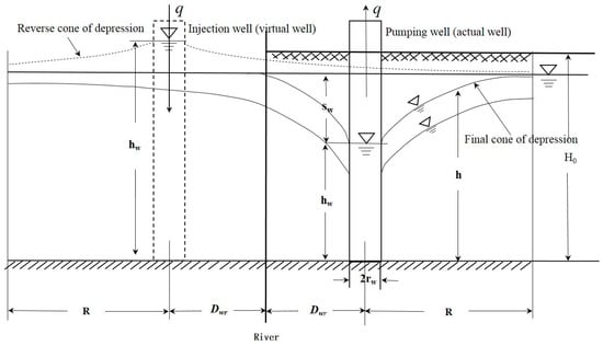 In this study, we tentatively established a method of design and optimization of pumping wells in riverbank filtration (RBF) by using analytical methods, in which the traditional methods such as the Mirror-Image Method, Dupuit Equation and Interference Well Group Method were jointly adopted. The method assumed that the phreatic aquifer was fully penetrated by the linear river in the vertical dimension, and there was a close hydraulic relation between the surface water and groundwater, both of which had nearly the same natural hydrological curve. The aquifer extended indefinitely in the other three directions and was bounded by an impervious rock at the bottom. The RBF was a homogeneous and isotropic medium, and there was no aquitard or aquiclude around the river. Thus, the model assumed was generally the same as that established by Theis (1941) [], which was usually considered the simplest mode of surface water-groundwater interactions and rare in practice []. The main purpose of this simplification was to facilitate calculation, so we used the Mirror-Image Method in this study, after we proved the applicability []. This method was established by Jacob (1979) [] to calculate the extending of the groundwater level, which is induced by pumping groundwater near the river and the corresponding water supply capacity of the pumping wells. Considering their simplicity, the mode and the corresponding method were often adopted in order to obtain the approximate solutions.