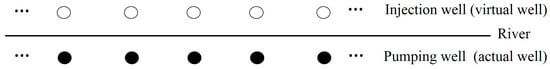In many practice cases, a set of pumping wells were arranged along a riverside replacing a single well due to the limited water supply capacity of the latter. Thus, the scenario where a well group along a linear riverside was considered in this study. The water supply capacity of this scenario was jointly impacted by the layout of the wells, and the exploitation plan. In this section, we deduced the calculating equations of the exploitation amount of a single well in the well group in addition to that of the well group. Those equations were convenient for the optimization of the layout of the wells and the exploitation plan in the following sections. The Mirror-Image Method was also applicable for this scenario, and the corresponding schematic diagram adapted from that of the scenario with a single well could be seen in Figure 2.