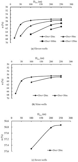 The third step was to screen those schemes in O2 with the favorable Dww, which was carried out by establishing the relationship between Dww and α (the interference coefficient between wells) and subsequently, finding the inflection point at the curve. The corresponding Dww value of the inflection point or around was considered to be the favorable Dww []. A strong relationship between Dww and α existed, and the greater the Dww was, the smaller α was, which could facilitate obtaining more water yield. However, the greater Dww would increase, the cost including waterline, power transmission system and the corresponding management cost []. Thus, it is the designer’s responsibility to minimize Dww as much as possible under the premise of ensuring meeting the water demand []. After screening the favorable Dww from O2, the possible schemes further decreased temporarily to form O3.
