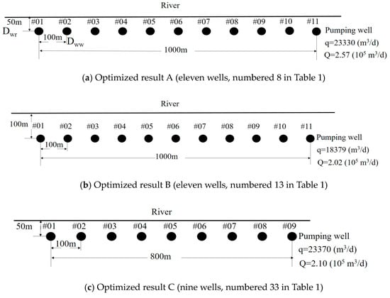 In fact, the need to go on to the fifth step is obvious, on occasion, especially when the budget is not adequate, or the riverbed clogging occurs. Out of the three left schemes (Figure 5), the scheme (a) would have to be abandoned considering saving water resource and energy, as the total water yield (Q = 2.57 × 105 m3/d) of it is much more than needed (Q′ = 2 × 105 m3/d). Nevertheless, scheme (a) could also become a choice if the water demand increases. And the scheme (b) would also have to be abandoned considering saving investment, as it has two more pumping wells compared with the scheme (c). Thus, the scheme (c) could be singled out as the final result of the optimizing effort, if other factors are not considered.