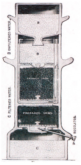 Photograph of a “spongy iron” filter as published by Nichols [48]. The raw water (B) is supplied from a bottle, which is inverted into the upper part of the inner vessel. Spongy iron (Fe0) is contained in an inner vessel. Below the Fe0 material are: (i) A layer of sand (‘prepared sand’), (ii) a regulator (A), and (iii) a receptacle (C) with a tap for filtered water. Prepared sand consists of three layers of aggregates: Pyrolusite (MnO2), sand, and gravel, which separate traces of iron from the filtrate.