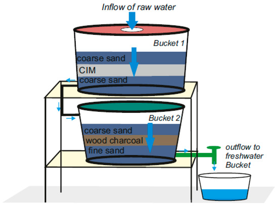 The filter consists of two plastic buckets placed one on top of the other in a rack. The buckets contain brick chips, layers of fine and coarse sand, wood charcoal, and CIM (Figure 2). The buckets are connected with plastic tubing and have valve controls near the bottom [55,61,62]. The process does not require any maintenance such as backwashing or regeneration of media [61,62]. Etmannski [61] reported that the life span of the filter is less than two years. The exhausted filter material is replaced and the used material is disposed of in an engineered landfill. The sole problem of SONO filter is that expiry dates are often ignored, partly because the filters are not really affordable for the population. Moreover, it is often difficult for communities with limited expertise to determine the end of the lifespan of the filter. To address this limitation, developing a simple Fe0-based clock system to avoid the use of exhausted filters is part of the concept presented in the current communication [117].