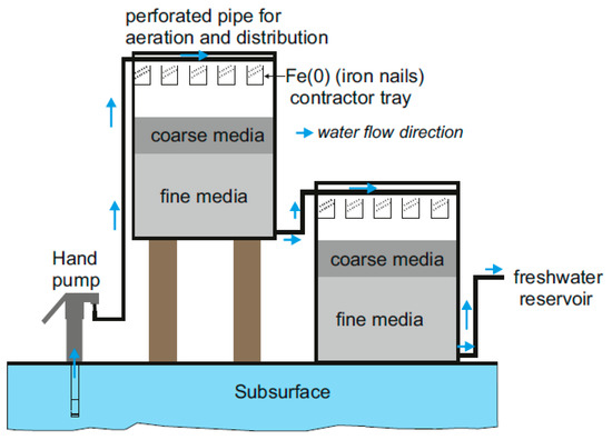 The Indian Institute of Technology Bombay (IITB) filter consists of two tanks that are similar in design (Figure 3). Well-water is pumped into the top of the first tank, and sprinkled into the top trays using a perforated pipe [5,61,62]. The aerated water comes into contact with iron nails (Fe0), which are held in trays (Figure 3). Fe0 is used to generate FeII species, which are oxidized to FeIII by dissolved oxygen (O2), thus generating iron corrosion products. Iron corrosion products (FeCPs) act as adsorbents for arsenic removal [118,119,120,121,122]. Sand is not used in the IITB filters as it would trap all the FeCPs in the top layers, and cause clogging, which would then require frequent cleaning. The filter bed is made up of stone chips and gravel, which reduce the head-loss and allow the FeCPs to penetrate deeper into the filter, thus achieving a higher contact time [5,61,62]. A sequence of two or three identical tanks forms a complete arsenic removal system, with a tap at the bottom of the last tank, which is used directly by the consumer [5,61]. The number of tanks depends on the initial concentration of arsenic in the local groundwater. The generated waste, supposedly FeCPs and AsV, is certainly stable under oxic conditions [123], meaning that substantial As leaching from the waste is not likely to occur. The operators of these systems are trained volunteers who are responsible for maintenance. Water is provided for free to the whole community.