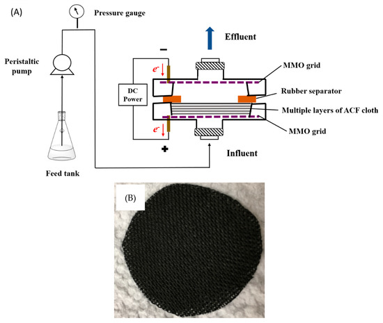 (A) A schematic diagram of the REM operation and (B) a picture of activated carbon fiber cloth (ACFC). MMO: mixed metal oxide.
