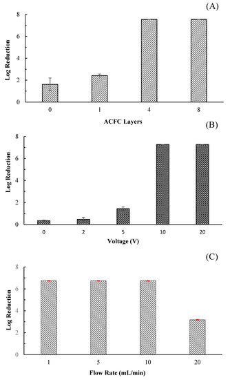 Bacterial log reduction by REM treatment at different conditions: (A) different ACFC layers at 10 V cell voltage and 10 mL/min flow rate; (B) different voltage with 4 ACFC layers and 10 mL/min flow rate; (C) different flow rate with 4 ACFC layers and at 10 V cell voltage. The initial E. coli concentration was 107.5, 107.3, and 106.7 CFU/mL for the tests in (A), (B), and (C), respectively.