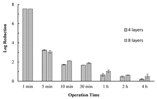 Bacterial log reduction by REM treatment with 4 or 8 ACFC layers at 10 mL/min and 10 V under continuous operation.