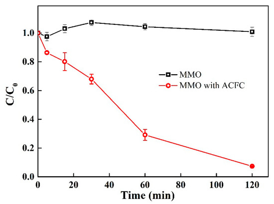 The loss of TA in 30 mL of a 50 mM Na2SO4 solution with MMO grid as the anode or MMO grid with four ACFC layers as the anode, respectively. Error bars represent standard deviations (n = 3). C0 = 10 µM, cell voltage = 10 V.