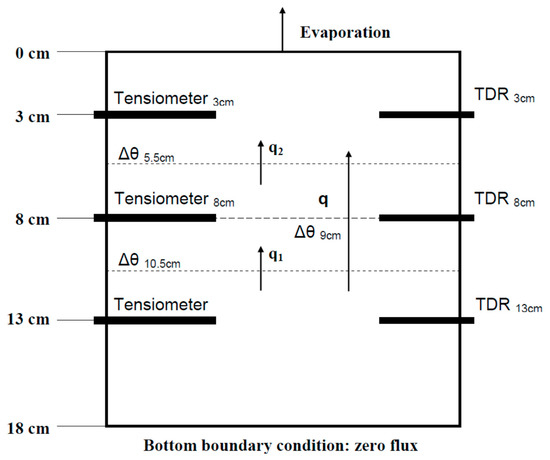 Experimental setup of the evaporation experiment. q, q1 and q2 are the upward water volume flux densities across the 8 cm, 10.5 cm and 5.5 cm boundaries, respectively.